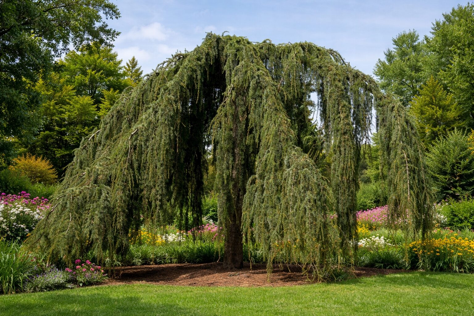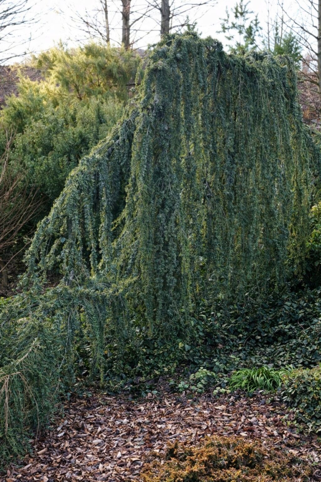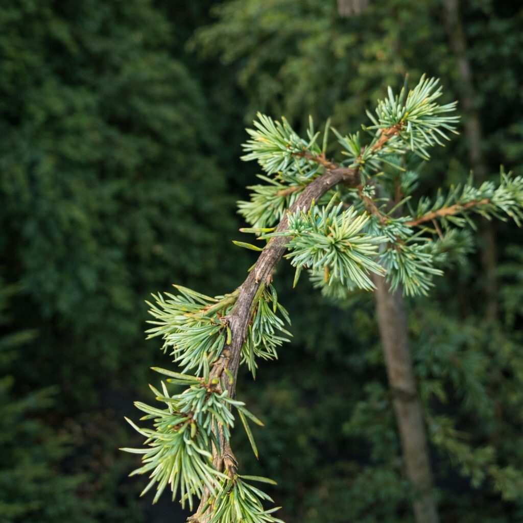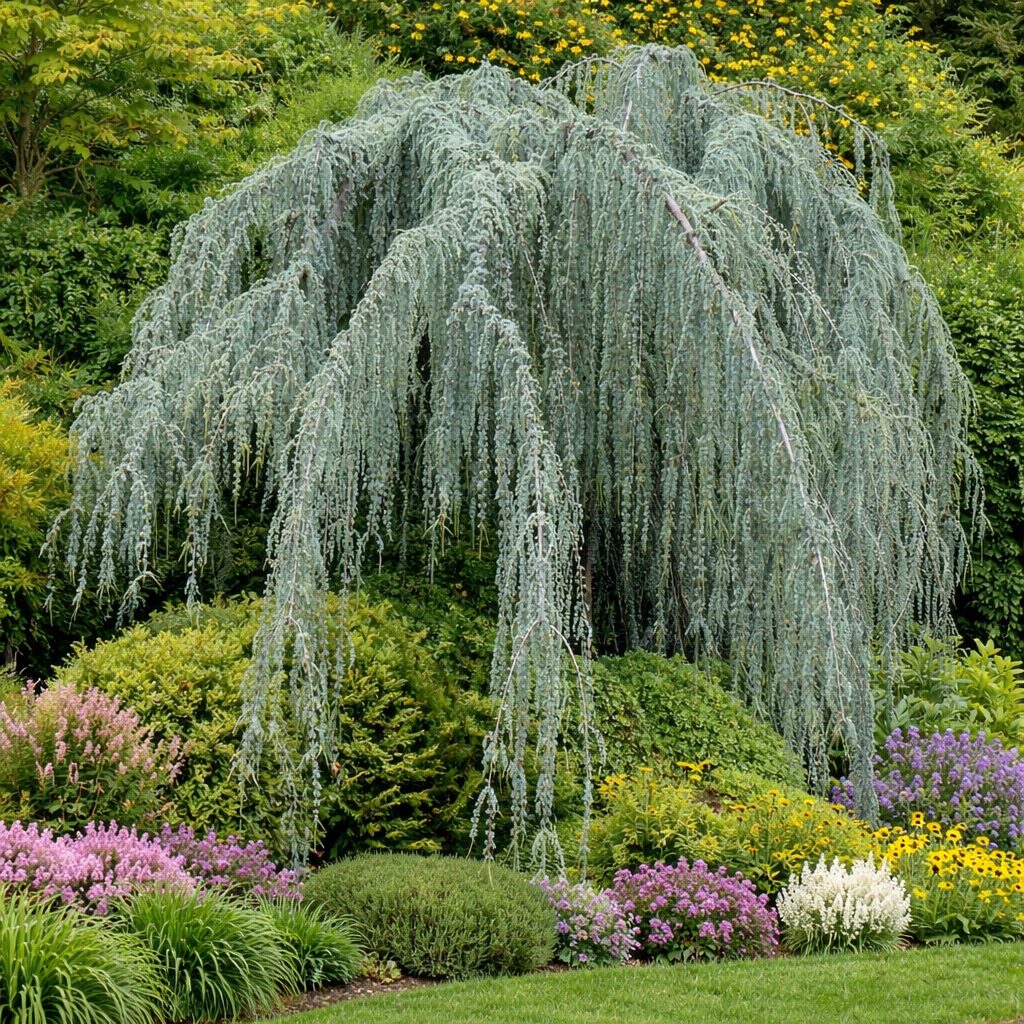 Cedr atlaski ‘Glauca Pendula’ to wyjątkowa, wolno rosnąca odmiana o malowniczym, kaskadowym pokroju. Tworzy szeroko rozpostarte, zwisające gałęzie, gęsto pokryte srebrzysto-niebieskimi igłami długości do 2,5 cm. Docelowo osiąga około 4–6 m wysokości i nawet do 10 m szerokości. Dodatkowym atutem jest szara, spękana kora oraz wzniesione szyszki, które podkreślają jego egzotyczny charakter.