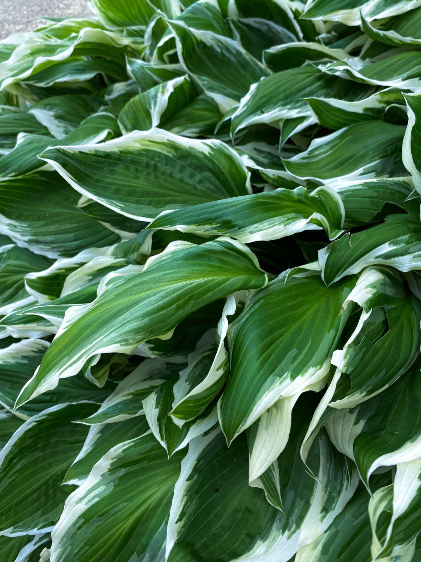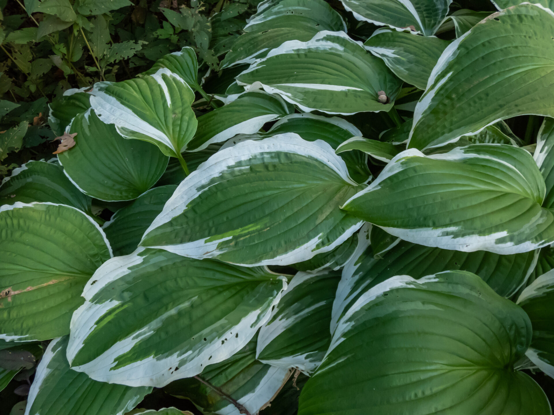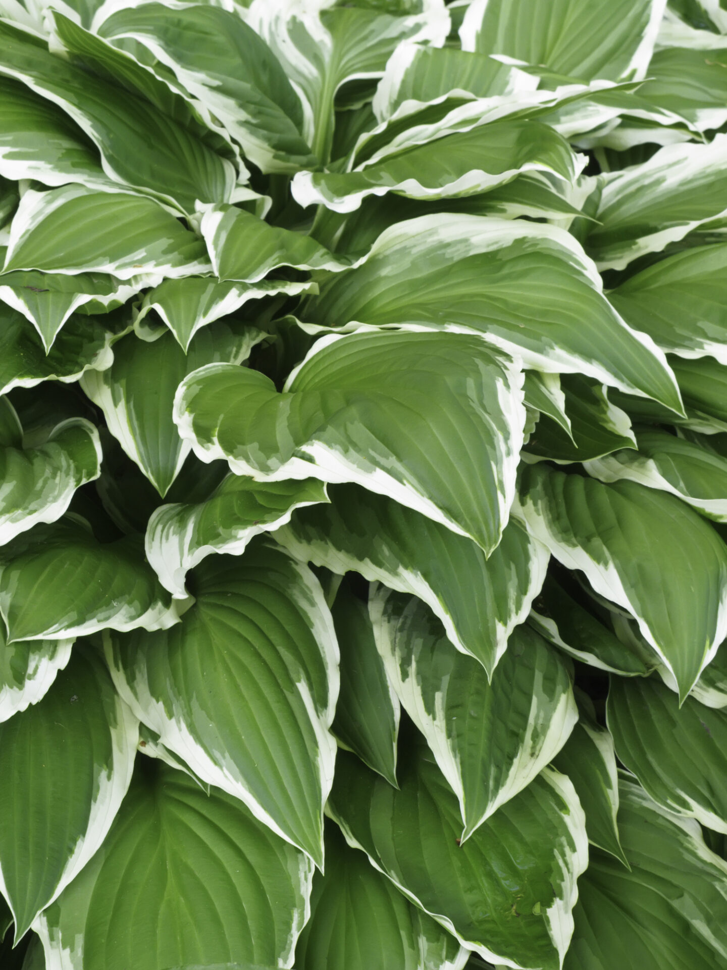 Tworzy zwarte kępy złożone z wydłużonych, owalnych liści o zaostrzonych wierzchołkach. Blaszki liściowe mają do 23 cm długości i 14 cm szerokości. Ich centralna część jest intensywnie zielona, obrzeżona nieregularną, biało-kremową obwódką. Szczególną ozdobą są czerwono zabarwione ogonki oraz drobne czerwone kropki przy nasadzie nerwu głównego. Barwne ulistnienie pięknie kontrastuje z kwiatami i dodaje roślinie elegancji. Odmiana bardzo dekoracyjna i atrakcyjna także w uprawie pojemnikowej.