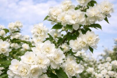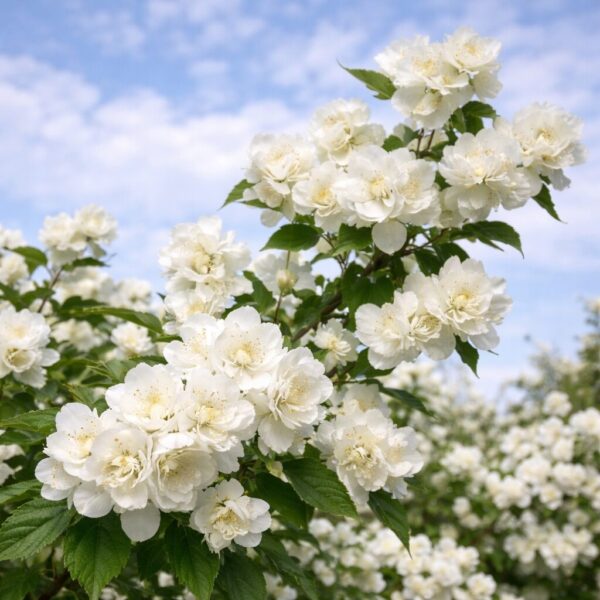W maju i czerwcu krzew obsypuje się dużymi, pełnymi, śnieżnobiałymi kwiatami o średnicy do 4 cm, które wydzielają intensywny, słodki zapach. Kwiaty pojawiają się zarówno na starszych, jak i młodych pędach, co zapewnia długie i efektowne kwitnienie. Ciemnozielone liście tworzą gęste, eleganckie tło dla kwiatów, a roślina pozostaje dekoracyjna przez cały sezon. Doskonale prezentuje się solo, w grupach, wzdłuż ścieżek, a także jako niski żywopłot.