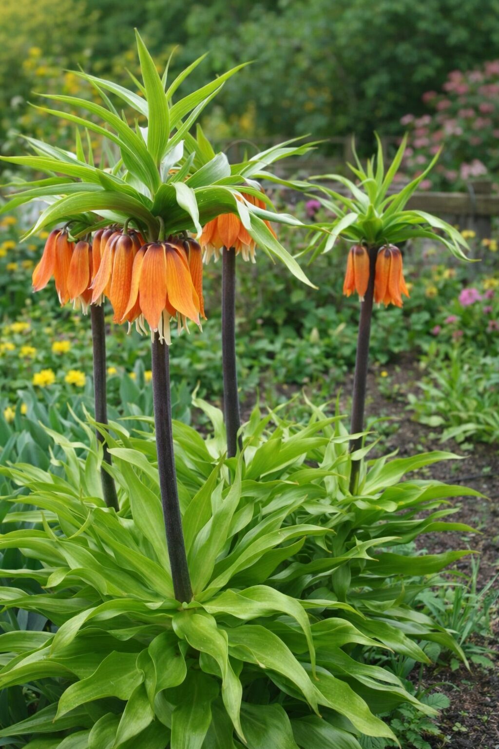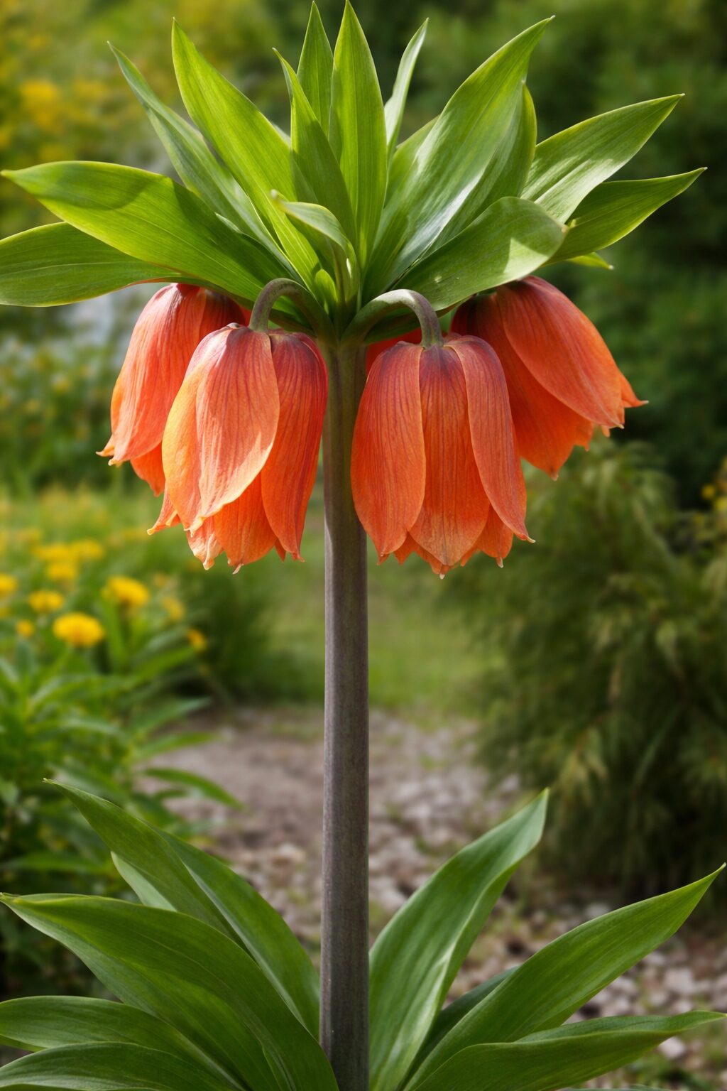 Cesarska korona ‘Orange Beauty’ to wyjątkowo okazała roślina cebulowa, która od wieków zachwyca swoją egzotyczną formą i intensywną barwą. Wytwarza mocne, wzniesione pędy osiągające 70–100 cm wysokości, zakończone okółkiem dzwonkowatych, pomarańczowych kwiatów. Nad nimi wyrasta charakterystyczny pióropusz zielonych liści, przypominający królewską koronę. Kwitnie wiosną, w maju, stanowiąc jeden z najbardziej efektownych akcentów tego okresu.