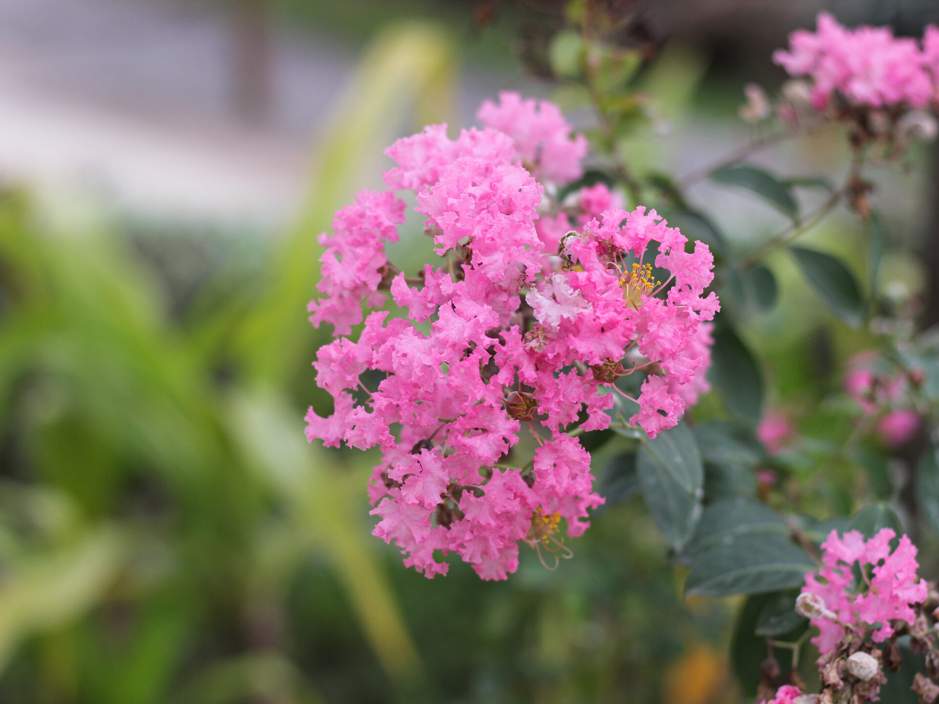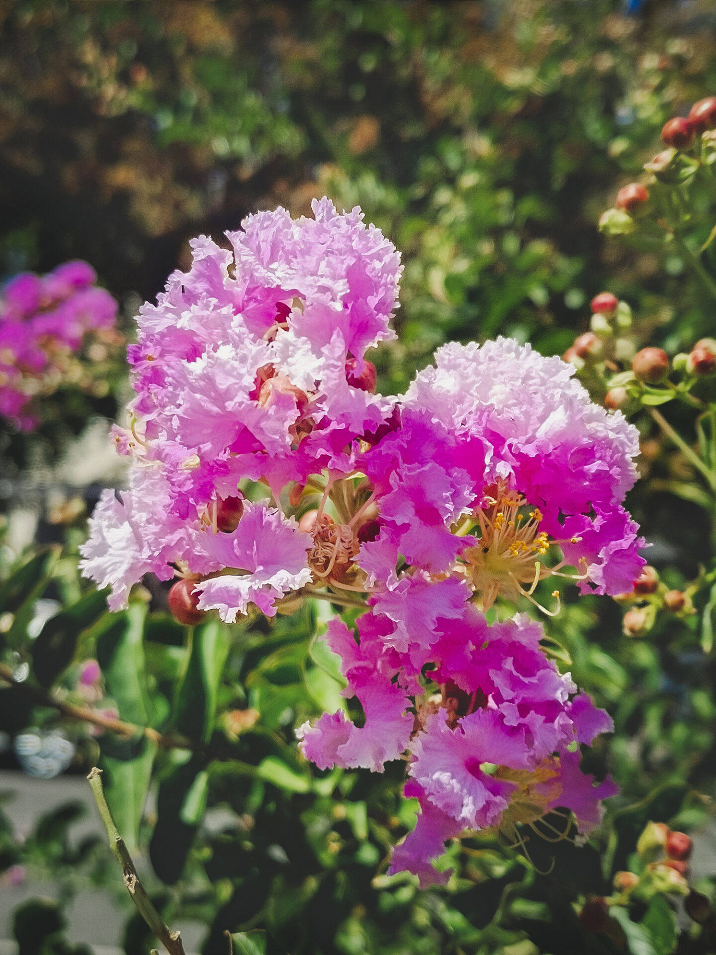 Intensywnie różowe, pełne, pofalowane kwiaty utrzymują się przez całe lato i jesień, tworząc efektowne wiechy. Liście błyszczące, jesienią przebarwiają się na złociste i pomarańczowe odcienie, a gładka, łuszcząca się kora przypomina wyglądem platana. Zwarty, kulisty pokrój rośliny sprawia, że prezentuje się bardzo atrakcyjnie. Doskonale nadaje się do małych ogrodów, na rabaty, tarasy i balkony, a także do uprawy w donicach. Świetnie wygląda sadzona w grupach lub jako soliter.