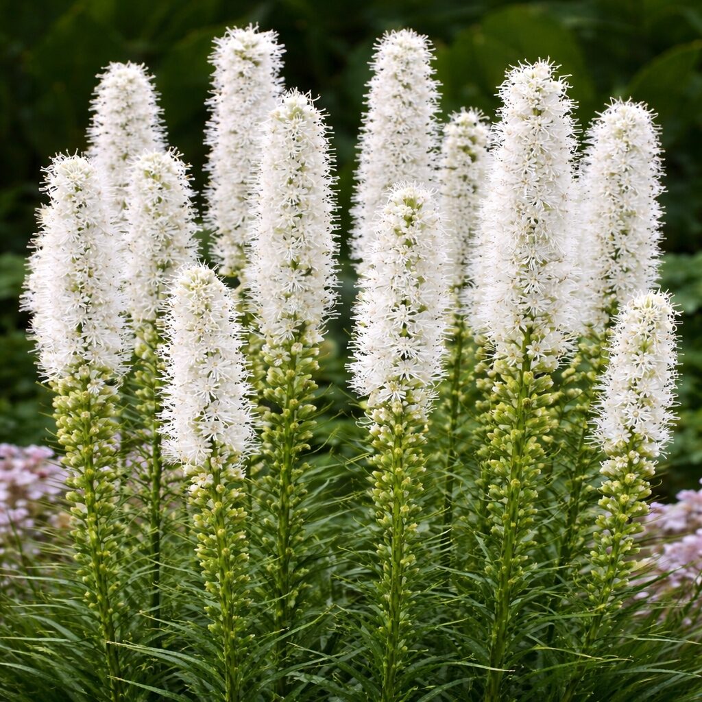Liatra kłosowa ‘Alba’ tworzy zwarte kępy wąskich, niemal trawiastych liści. Ponad nimi wyrastają smukłe, pionowe, kłosowate kwiatostany w czystym, białym kolorze. Kwiaty rozwijają się stopniowo wzdłuż pędu, co podkreśla strzelisty i uporządkowany charakter rośliny. Doskonale prezentuje się na rabatach bylinowych oraz w nasadzeniach naturalistycznych. Bardzo dobrze komponuje się z trawami ozdobnymi, lawendą, jeżówkami i rudbekiami. Kwiatostany nadają się również na kwiat cięty – są trwałe i długo zachowują świeżość.