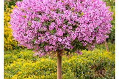 Lilak ‘Princess Perfume’ w formie piennej to szczepiona odmiana o kulistej, zwartej koronie, osadzona na pniu. Tworzy eleganckie, regularne drzewko, które w zależności od wysokości szczepienia osiąga zwykle około 2–3 m wysokości całkowitej. Odmiana kwitnie w maju i na początku czerwca, tworząc efektowną, pachnącą koronę obsypaną kwiatami.