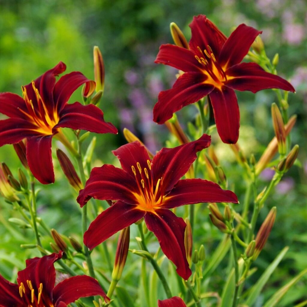 ‘Berrylicious’ to wyjątkowo dekoracyjna odmiana liliowca o bardzo dużych, ciemnoczerwonych kwiatach. Płatki zdobi wyraźne fioletowo-bordowe oko, delikatna falbanka na brzegach oraz intensywnie żółta gardziel, która dodaje kwiatom głębi i kontrastu. Roślina tworzy rozłożyste, zwarte kępy z długich, lancetowatych, zielonych liści i dorasta do około 60–80 cm wysokości. Kwitnie obficie w lipcu i sierpniu.