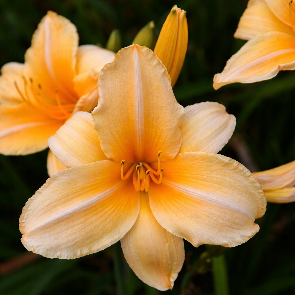 Ponad nimi wyrastają sztywne, bezlistne pędy zakończone bardzo dużymi, falbaniastymi kwiatami o średnicy do 14 cm. Kwiaty w odcieniu kremowo-żółtym do brzoskwiniowo-żółtego, z jaśniejszą gardzielą. Każdy kwiat utrzymuje się jeden dzień, jednak roślina stale wytwarza nowe pąki, dzięki czemu przez wiele tygodni pozostaje efektowną ozdobą rabaty.