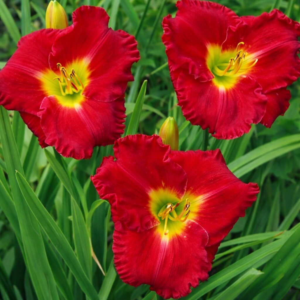 Kwiaty duże, 10–13 cm średnicy, w intensywnym czerwono-malinowym kolorze. Płatki mają delikatnie pofalowane brzegi, a ich barwa kontrastuje z wyraźną żółto-zieloną gardzielą. Kwiaty pojawiają się licznie na pędach, dzięki czemu roślina kwitnie efektownie przez wiele tygodni. Liście ciemnozielone, wąskie, łukowato wygięte, tworzą zwarte i estetyczne kępy. Odmiana bardzo wyrazista kolorystycznie, dobrze widoczna z daleka.