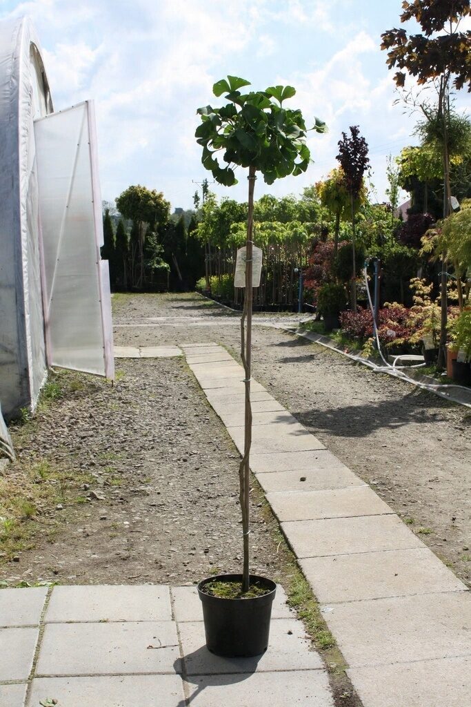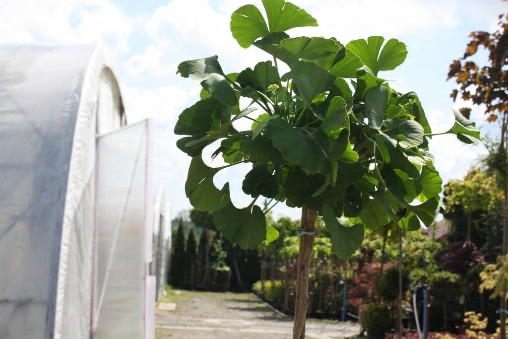 Miłorząb japoński ‘Mariken’ na pniu (Ginkgo biloba ‘Mariken’) to karłowa odmiana miłorzębu szczepiona na pniu, która wyróżnia się zwartą, kulistą koroną i powolnym tempem wzrostu. Ma charakterystyczne, wachlarzowate liście w jasnym odcieniu zieleni, które jesienią pięknie przebarwiają się na intensywny, złocisty kolor. Forma na pniu sprawia, że ‘Mariken’ jest wyjątkową ozdobą, przyciągającą wzrok w każdym ogrodzie.