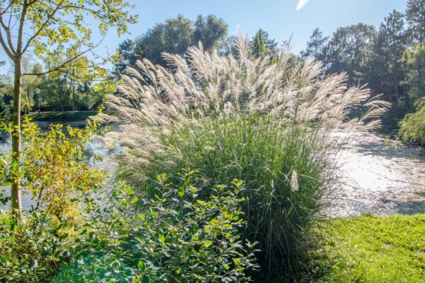 Długie, wąskie liście w kolorze jasnozielonym, przebarwiające się jesienią na pomarańczowo. Od września do późnej jesieni na wierzchołkach źdźbeł pojawiają się pierzaste, gęste, karbowane kwiatostany. Na początku są ciemnoróżowe z delikatnym, żółtym odcieniem, a w miarę przekwitania robią się srebrnobiałe.