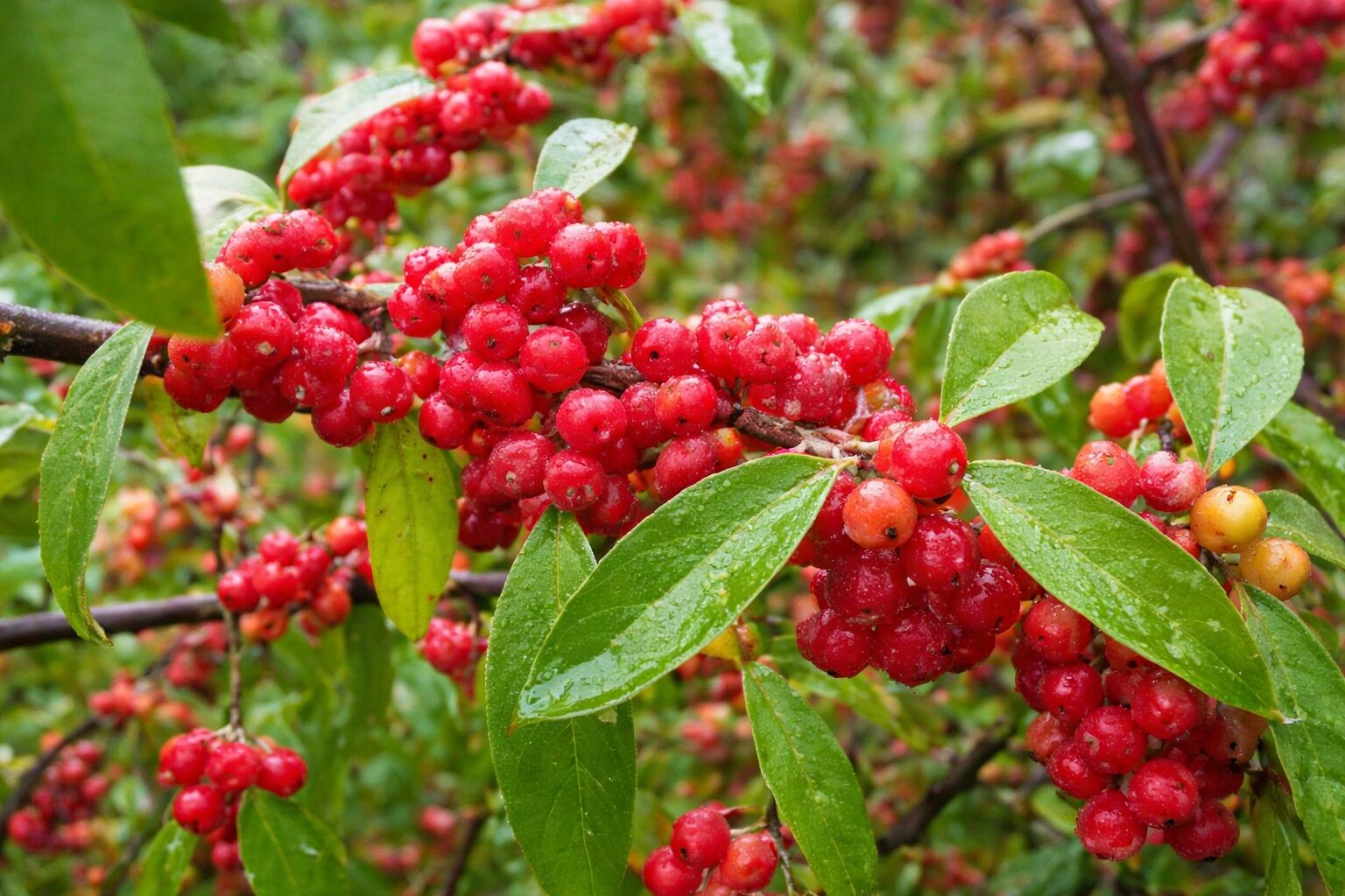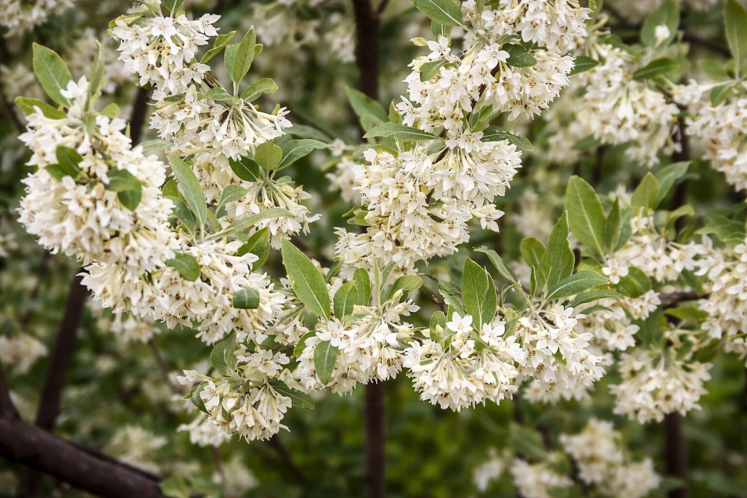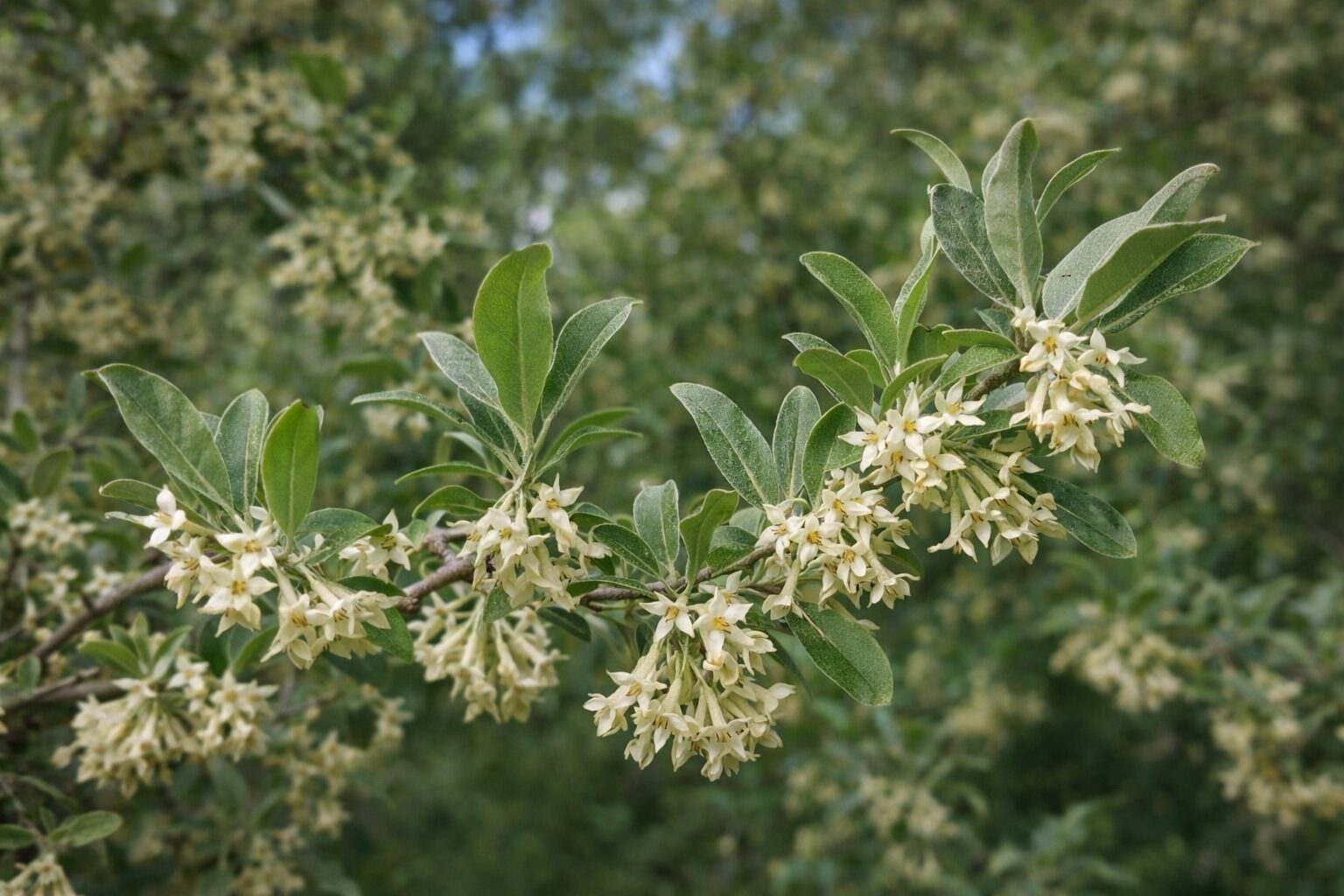 Krzew wyróżnia się dwubarwnymi liśćmi – z wierzchu zielonymi, a od spodu srebrzystymi, które nadają mu jasny, dekoracyjny wygląd przez cały sezon. W maju–czerwcu pojawiają się drobne, żółtawobiałe, silnie pachnące kwiaty, chętnie odwiedzane przez owady zapylające. Jesienią roślinę zdobią liczne, czerwone owoce, długo utrzymujące się na pędach, efektownie kontrastujące z ulistnieniem i dodatkowo podnoszące jej walory ozdobne.