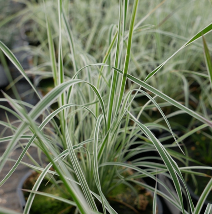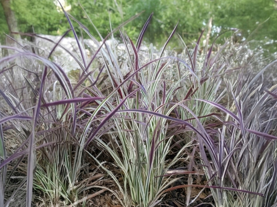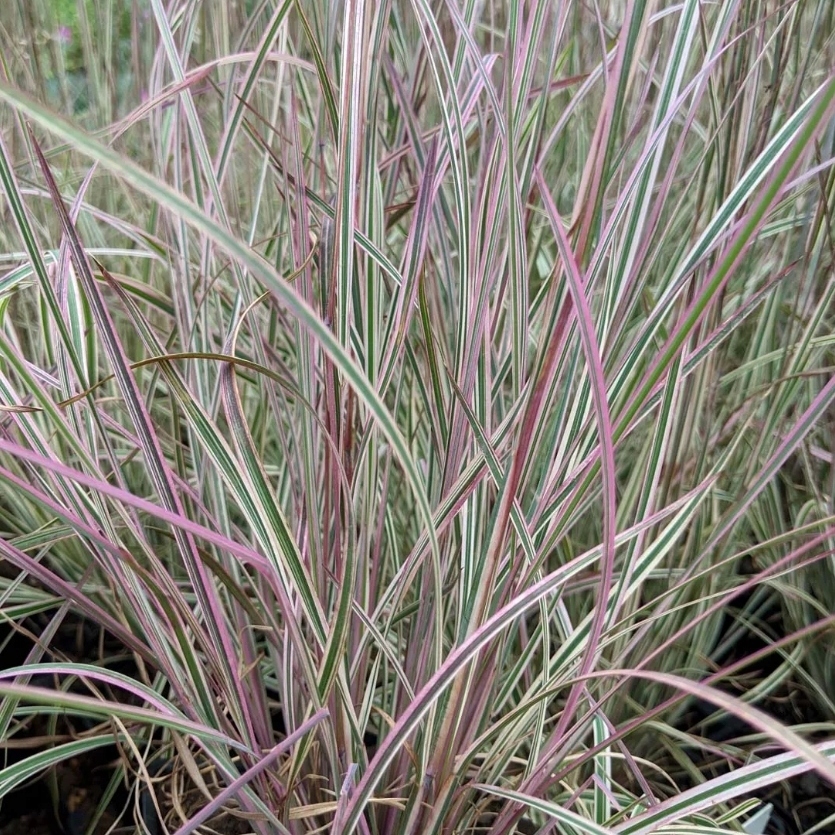 Liście długie, wąskie, ostro zakończone i lekko przewieszające się, zebrane w zwarte kępy. Blaszka liściowa jasnozielona, ozdobiona wyraźnym, kremowo-białym marginesem. Na przełomie lata i jesieni przebarwia się na różowo-fioletowe odcienie, co nadaje roślinie wyjątkowego uroku. Ponad ulistnieniem pojawiają się subtelne, purpurowo-czerwone wiechy, które dodają lekkości całej kompozycji. Doskonale sprawdza się na rabatach, w ogrodach naturalistycznych i skalnych, a także w pojemnikach.