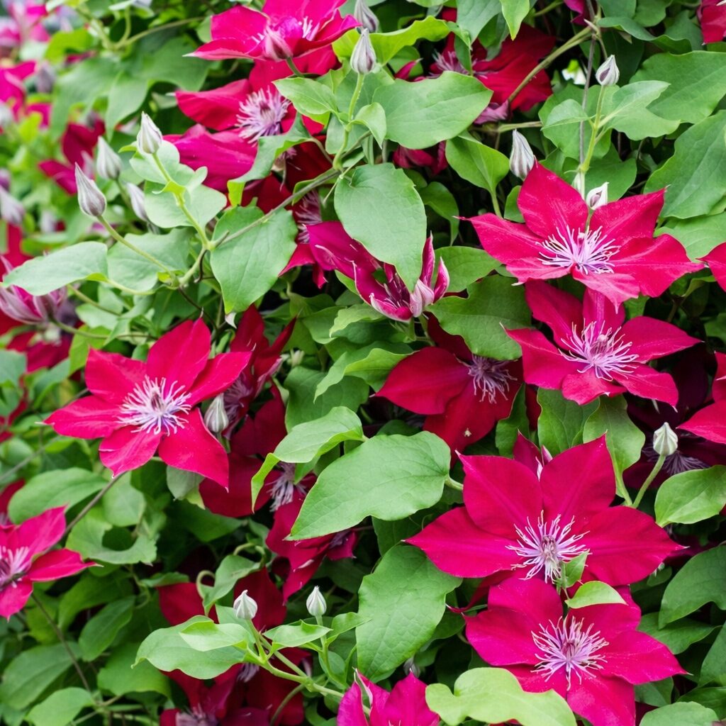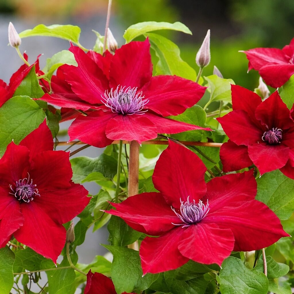 Wyjątkowo efektowna, kolekcjonerska odmiana o dużych, aksamitnych kwiatach w intensywnie czerwonym, głębokim odcieniu. Kwiaty osadzone są na całej długości pędów, od podstawy aż po wierzchołki, co zapewnia bardzo obfite i równomierne kwitnienie. Ciemnozielone liście stanowią doskonałe tło dla wyrazistych kwiatów. Powojnik ‘Nubia’ idealnie sprawdza się na pergolach, kratkach, trejażach i ogrodzeniach, a dzięki zwartemu pokrojowi doskonale nadaje się również do uprawy w pojemnikach na tarasach i balkonach. Świetny wybór do nowoczesnych i reprezentacyjnych aranżacji.