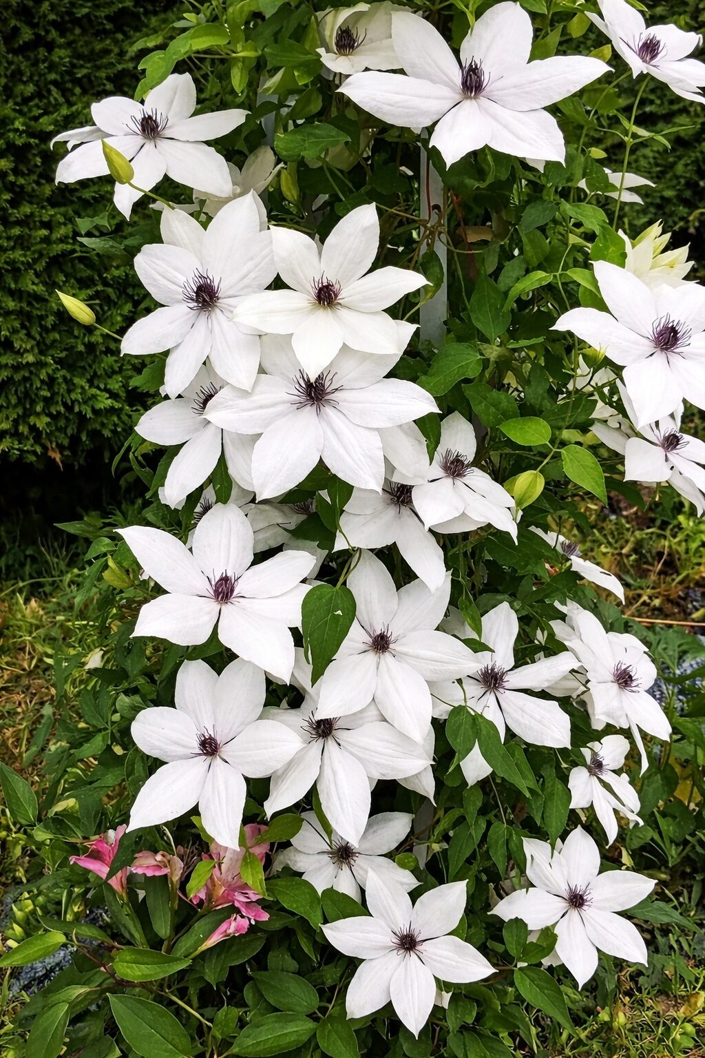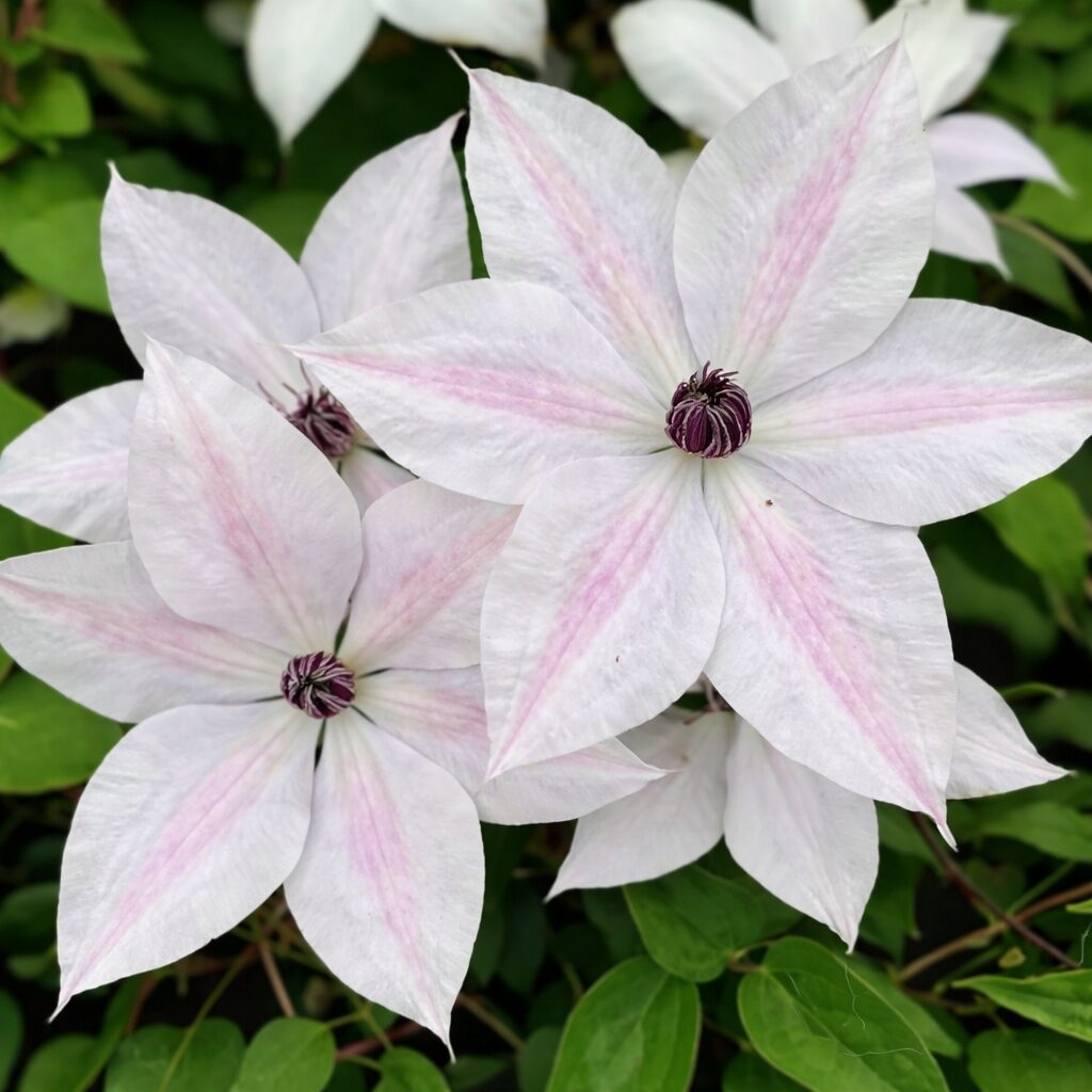 Odmiana wyróżnia się bardzo eleganckimi, dekoracyjnymi kwiatami w jasnej, subtelnej kolorystyce. Płatki są delikatnie białe z lekką, różową pręgą, a środek kwiatu zdobi efektowny, kolczasty pompon w odcieniach różu i fioletu. Kwiaty nadają roślinie lekkości i romantycznego charakteru, doskonale wpisując się w eleganckie i spokojne aranżacje ogrodowe. Zielone, gęste ulistnienie tworzy estetyczne tło dla kwiatów. Powojnik ‘Tsukiko’ świetnie sprawdza się na pergolach, trejażach, altanach i ogrodzeniach, a także w dużych pojemnikach na tarasach i balkonach.