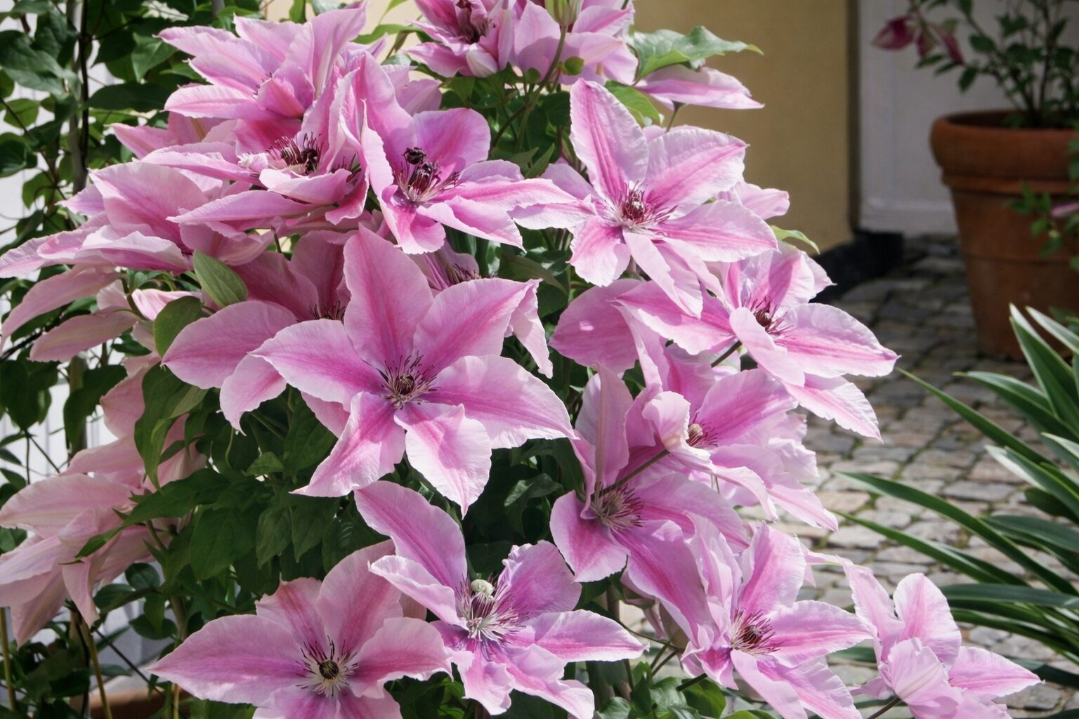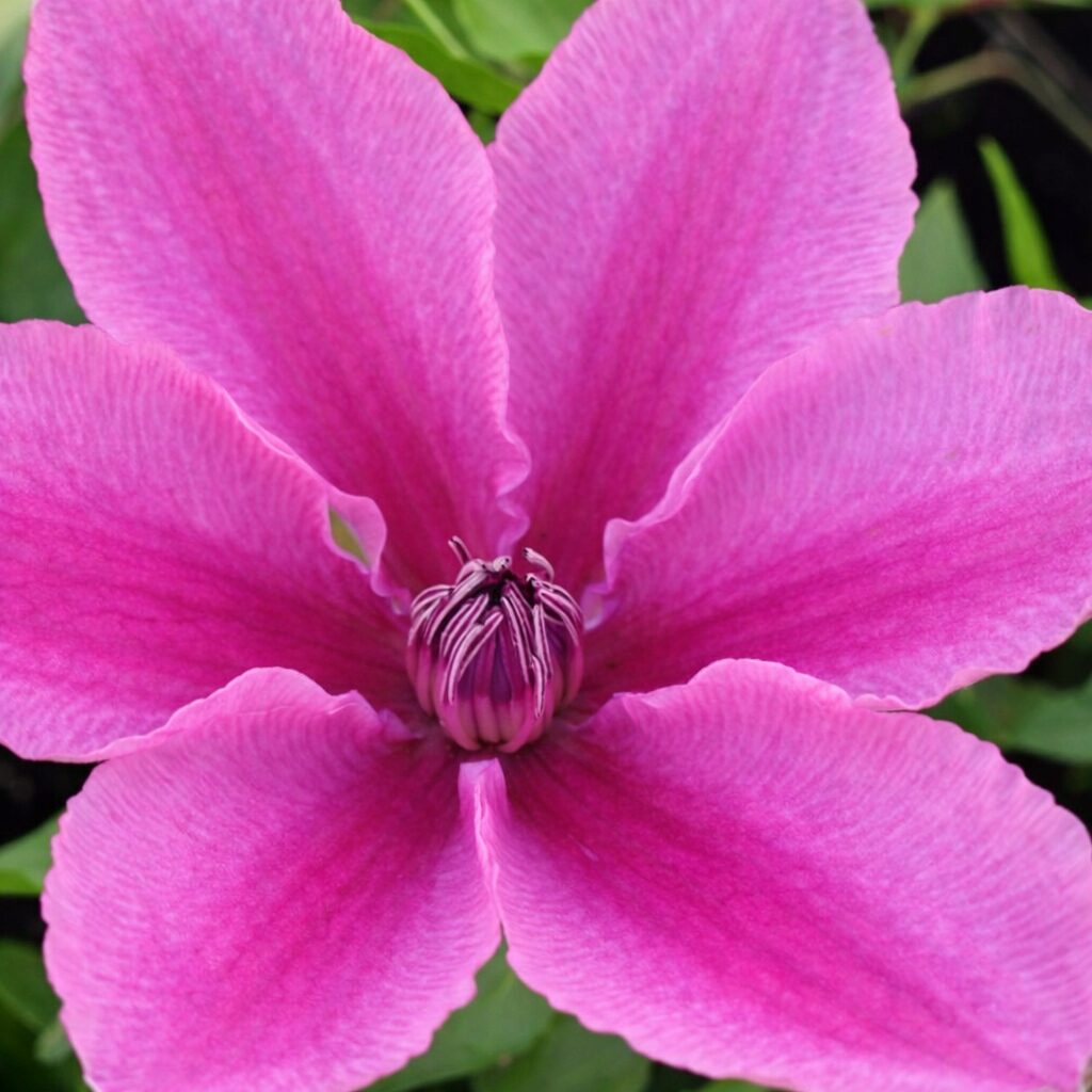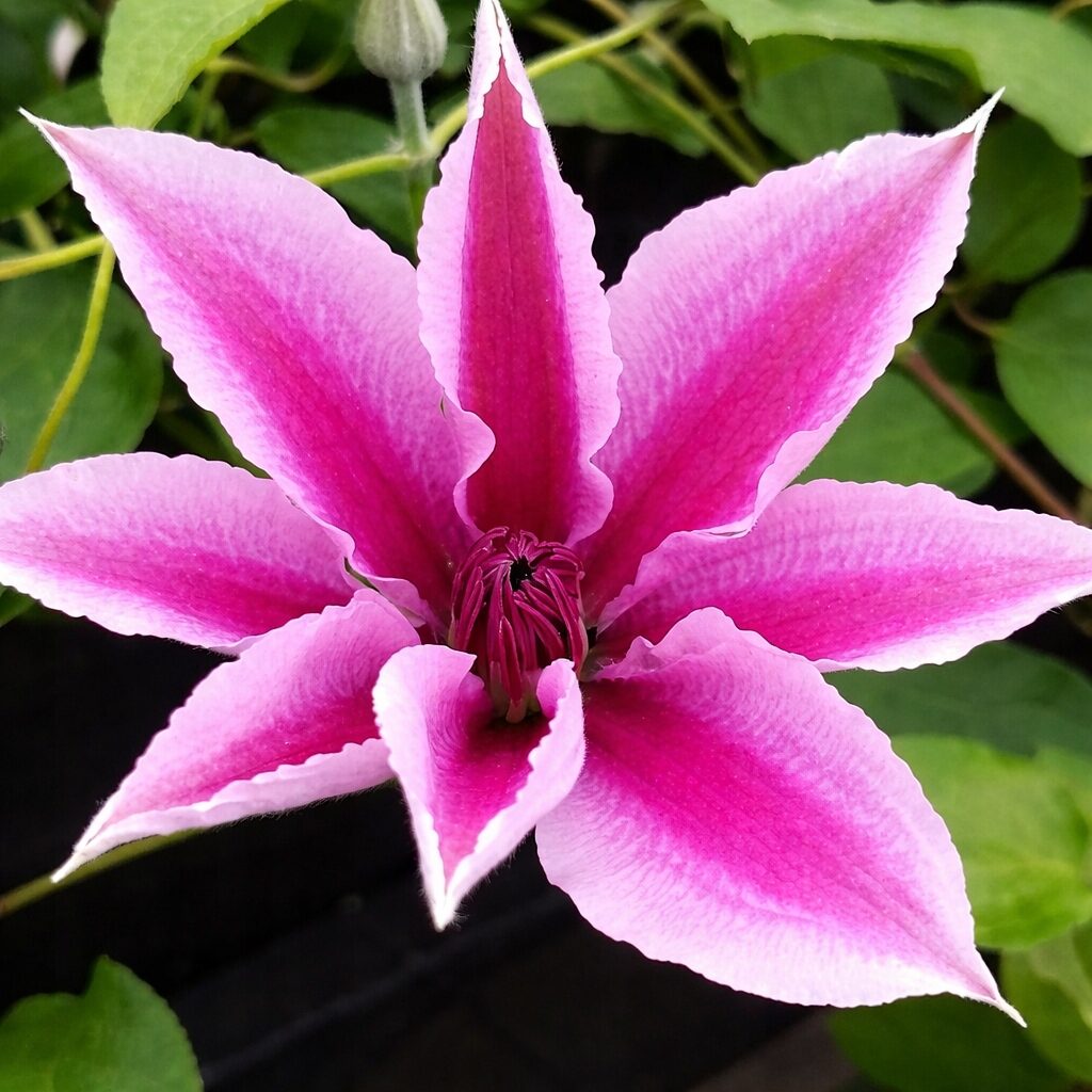 Odmiana o bardzo efektownych, dużych kwiatach w delikatnych, eleganckich odcieniach różu. Pofalowane płatki posiadają wyraźną, jaśniejszą pręgę biegnącą przez środek, a centrum kwiatu zdobi dekoracyjny, kolczasty pompon w barwach srebra i bieli. Kwiaty rozmieszczone są gęsto na pędach, tworząc atrakcyjny efekt wizualny przez długi czas. Ciemnozielone ulistnienie stanowi doskonałe tło dla jasnych kwiatów. Powojnik ‘Yuan’ świetnie sprawdza się na pergolach, kratkach, trejażach, altanach i ogrodzeniach, a także w nowoczesnych konstrukcjach ogrodowych. Roślina miododajna, chętnie odwiedzana przez pszczoły i motyle.