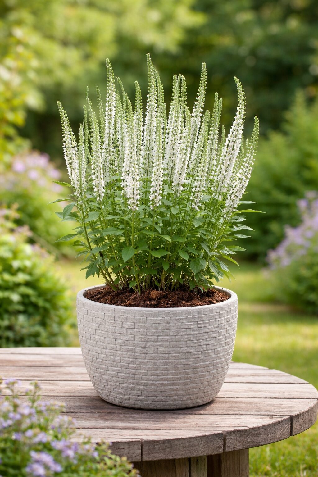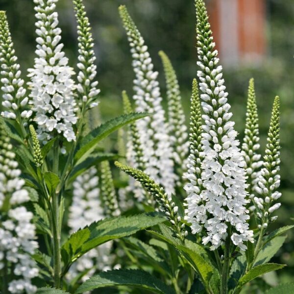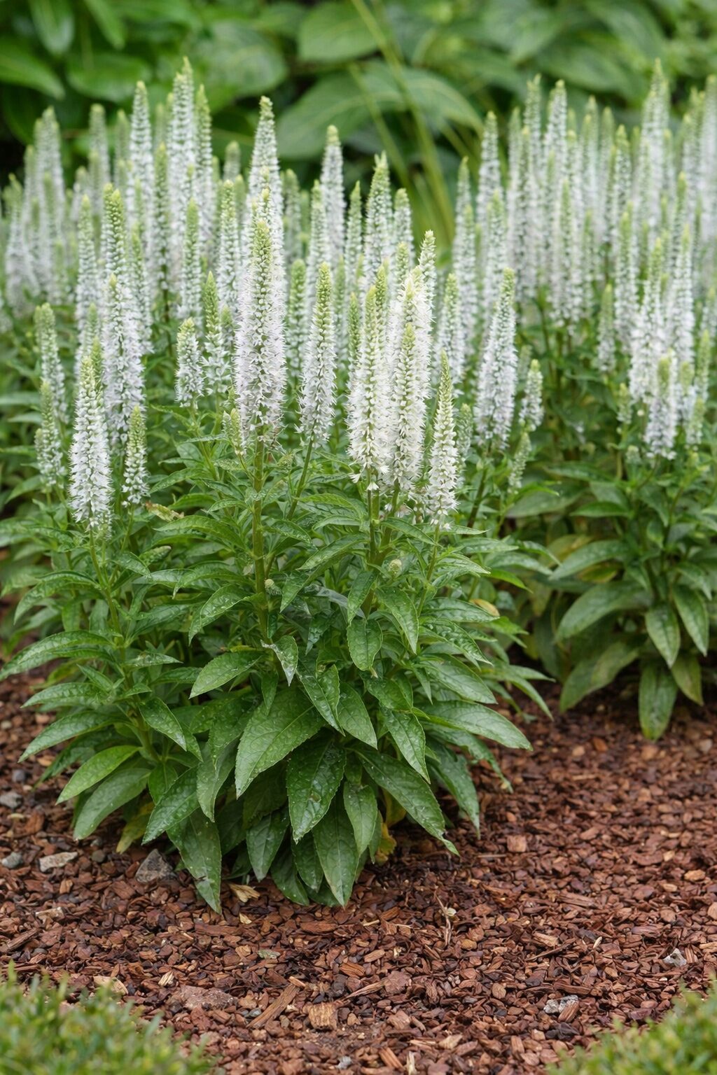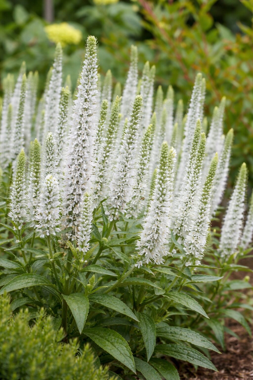 Przetacznik kłosowy ‘Snow Candles’ to niska, wieloletnia bylina o zwartym, wyprostowanym pokroju. Dorasta do około 20–30 cm wysokości, tworząc gęste, stopniowo rozrastające się kępy. Odmiana charakteryzuje się silnym wzrostem i dobrą trwałością, dzięki czemu przez wiele lat zachowuje estetyczny wygląd bez konieczności intensywnej pielęgnacji.