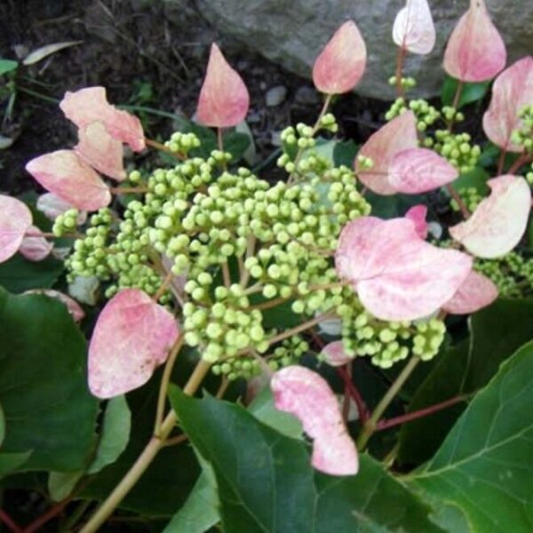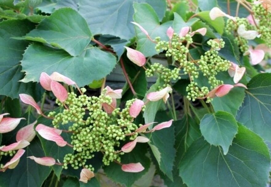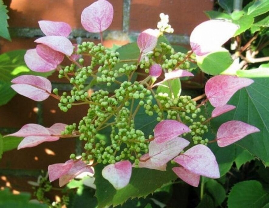 Duże, parasolowate kwiatostany o średnicy 25 cm z jasnoróżowymi działkami kwiatów płonnych (3–5 cm), delikatnie pachnące miodem. Liście ciemnozielone, sercowate, młode bordowo-brązowe, jesienią przebarwiają się na żółto. Roślina efektownie wygląda pnąc się przy ścianach, pergolach i ogrodzeniach, a także jako okrywowa pod drzewami i krzewami.
