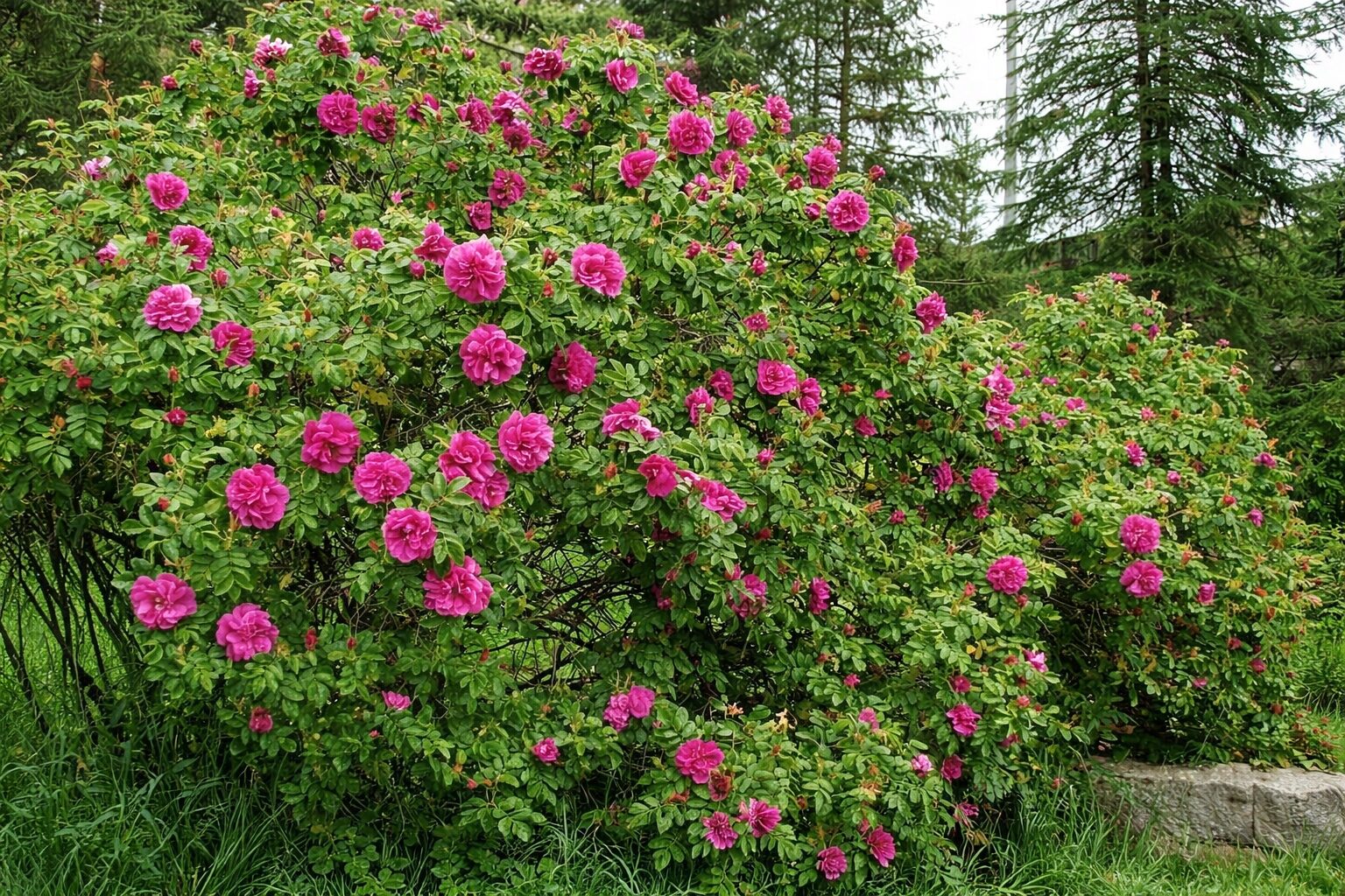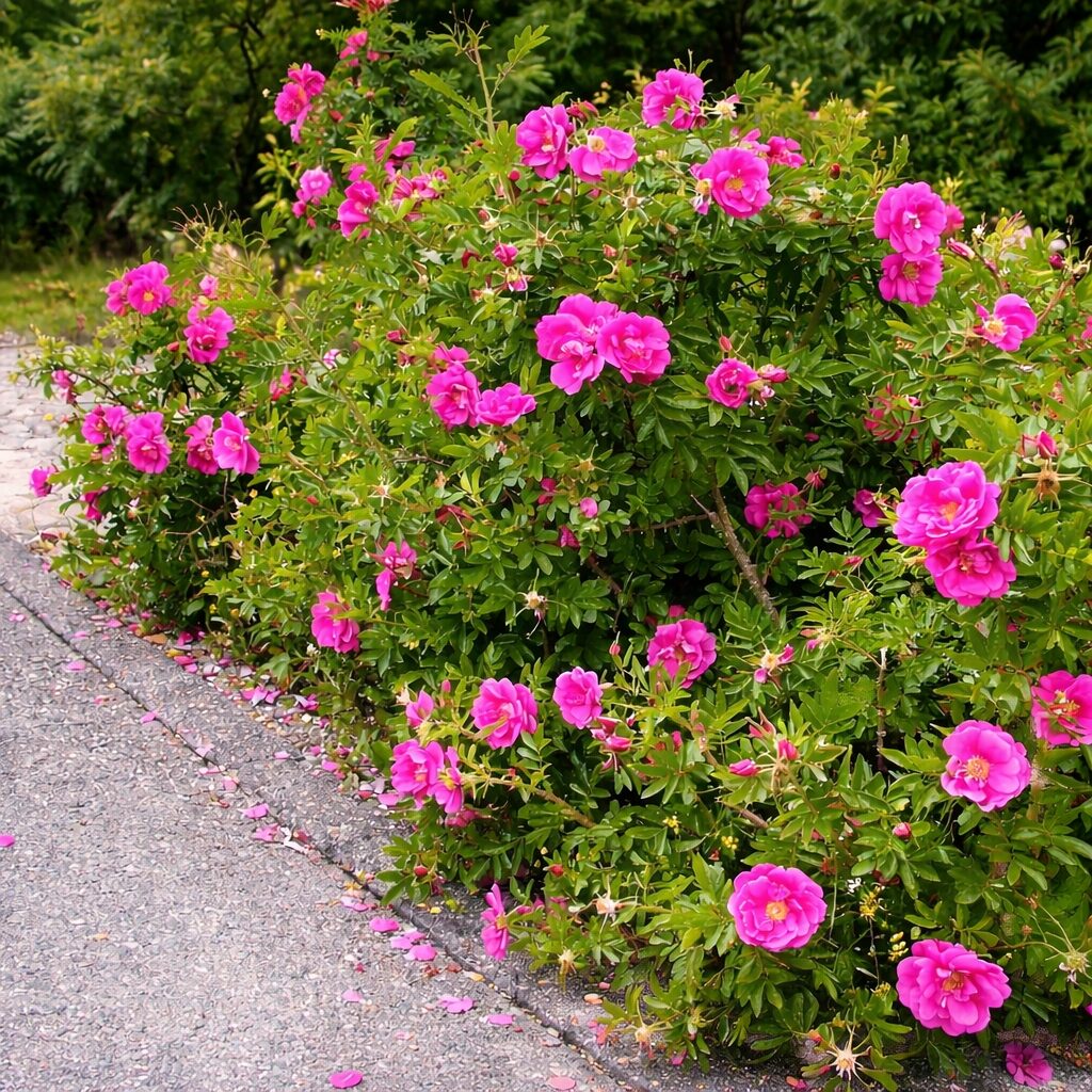 Duże, intensywnie różowe, pachnące kwiaty o średnicy do 12 cm pojawiają się bardzo obficie przez całe lato. Po kwitnieniu tworzy duże, pomarańczowo-czerwone owoce, niezwykle dekoracyjne i jadalne. Owoce są bogate w witaminę C, A oraz antyoksydanty – idealne na przetwory, herbaty i konfitury. Ozdobne, mocno pomarszczone liście jesienią przebarwiają się na żółto. Krzew jest atrakcyjny przez cały sezon.