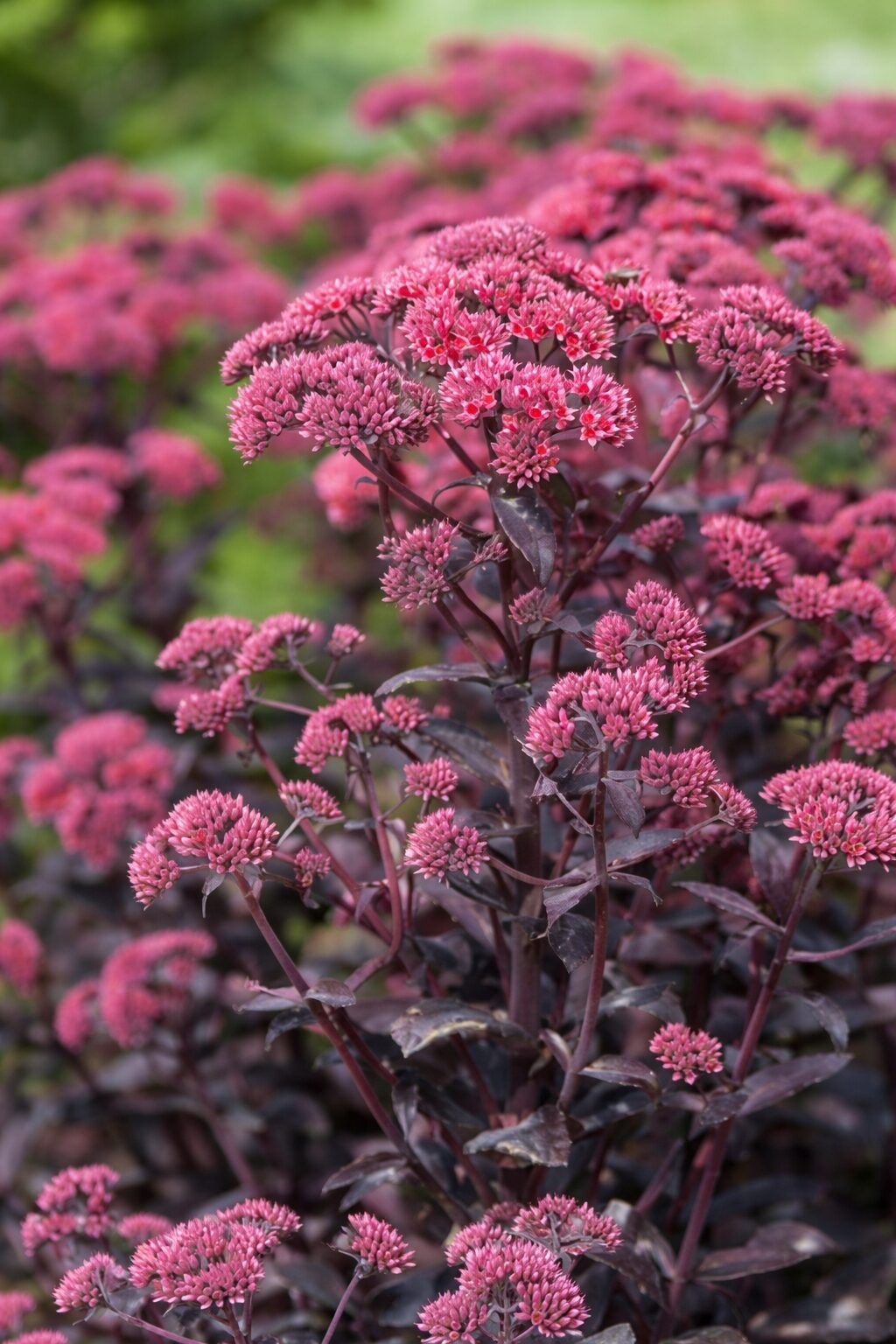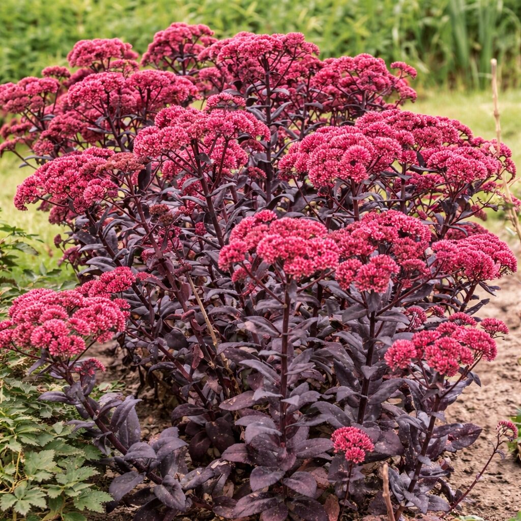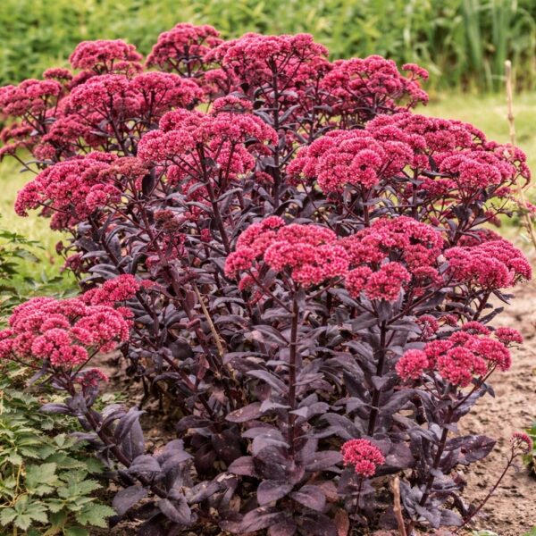 Wyjątkowo dekoracyjna odmiana o bardzo ciemnych, bakłażanowo-purpurowych liściach, które wiosną mają buraczkowy odcień, a latem niemal czernieją. Na tle liści efektownie prezentują się płaskie, różowo-czerwone kwiatostany, pojawiające się pod koniec lata. Roślina zachowuje ładny wygląd przez cały sezon. Silnie miododajna, przyciąga pszczoły i motyle. Idealna na rabaty bylinowe, do ogrodów nowoczesnych, skalnych oraz do pojemników.