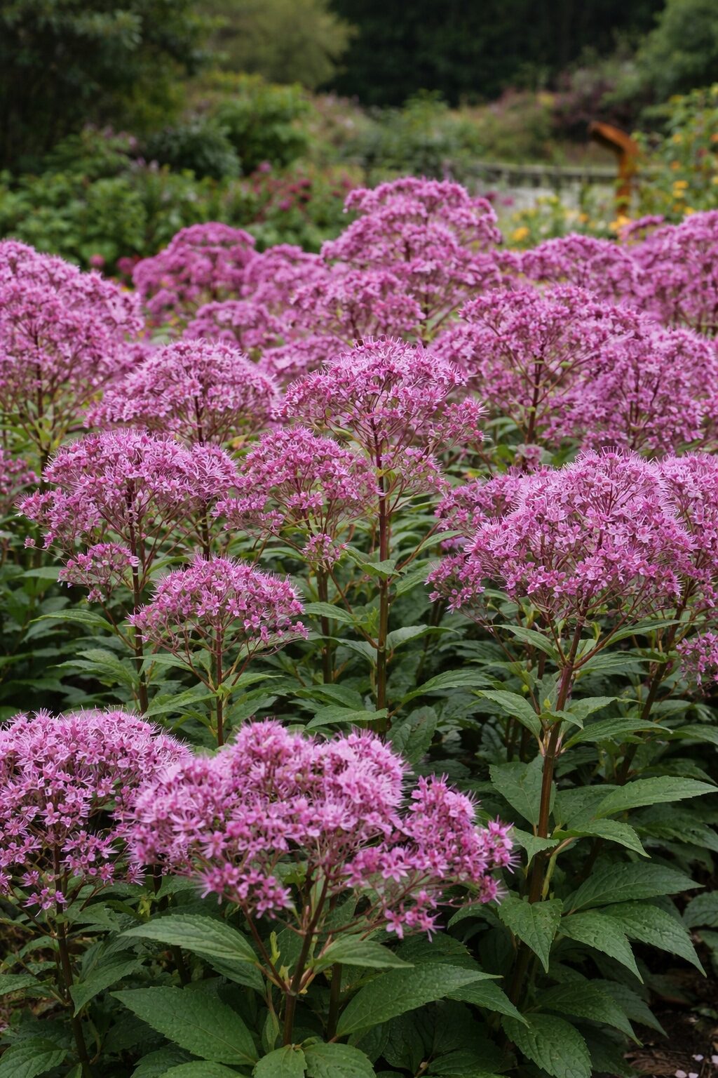 Roślinę zdobią ciemnozielone, lancetowate, błyszczące liście o wyraźnie ząbkowanych brzegach. Od lipca do września pojawiają się liczne, różowo-fioletowe, puszyste kwiaty, zebrane w gęste baldachogrona, efektownie kontrastujące z ulistnieniem. Kwiaty są miododajne, silnie przyciągają motyle i inne owady zapylające, a także nadają się do kwiatów ciętych.
