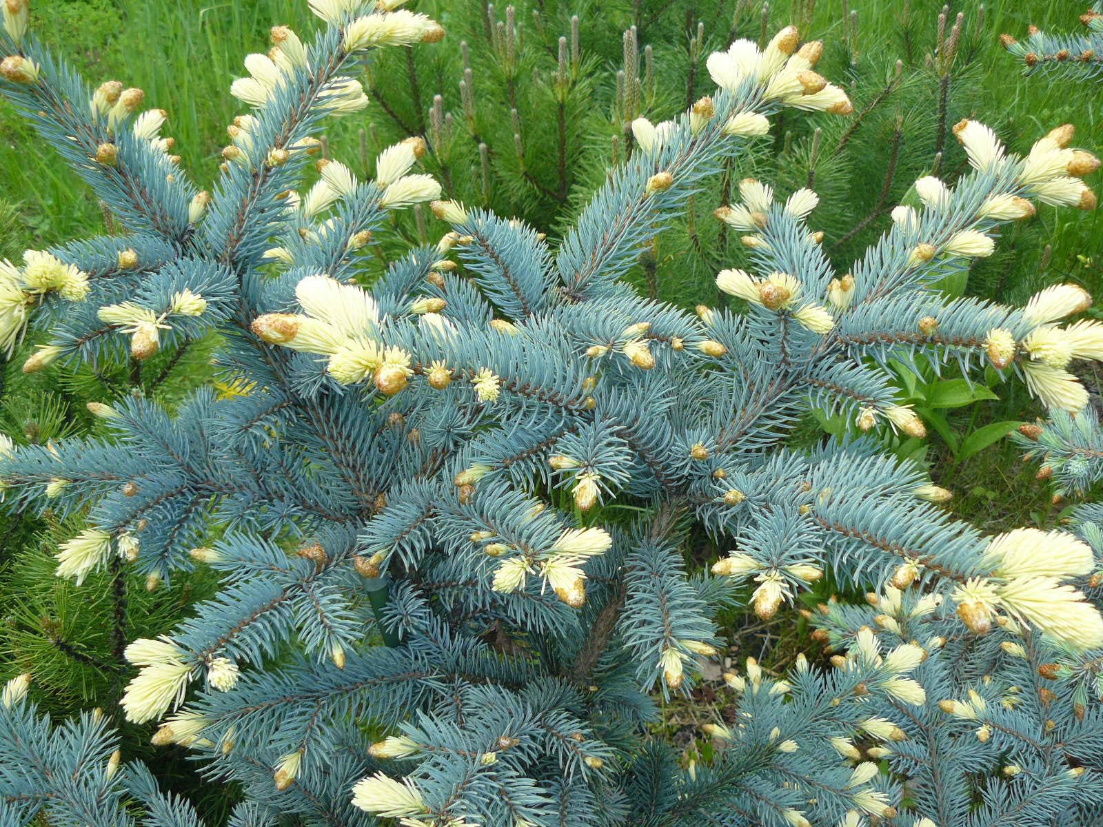 To, co odróżnia roślinę od swojego gatunku, to piękne, dekoracyjne, jasne przyrosty, które cudownie komponują się z zielononiebieską częścią igieł. Co ciekawe, kremowożółte końce bledną po kilku tygodniach, przybierając delikatnego niebieskiego koloru. Igły te są dosyć grube, sztywne i bardzo kłujące, mają mniej więcej 3 cm średnicy. Są one ułożone promieniście na krótkich, zielonych, sztywnych, poziomych pędach. Zimą drzewka nie ulegają zniekształceniu pod ciężarem śniegu.