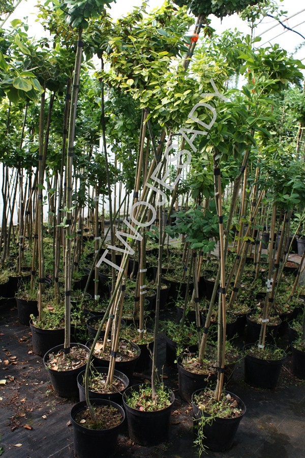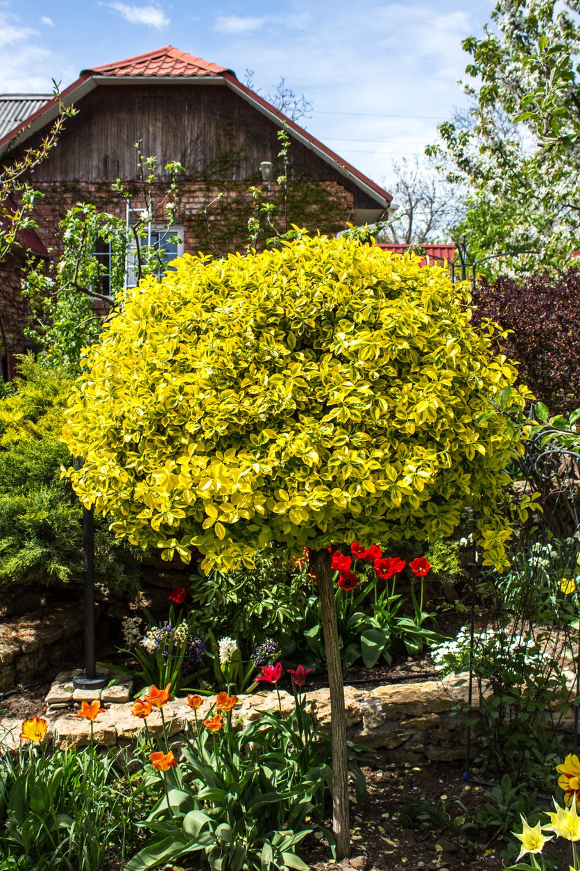 Trzmielina Fortune’a ‘Gold’ na pniu to ozdobny, zimozielony krzew o wyprostowanym pokroju, zaszczepiony na pniu o stałej wysokości ok. 80 cm. Roślina nie zwiększa już wysokości, rozwija się jedynie w obwodzie – korona dorasta do około 100 cm średnicy. Naturalnie występuje w Europie, Azji oraz Ameryce Północnej.