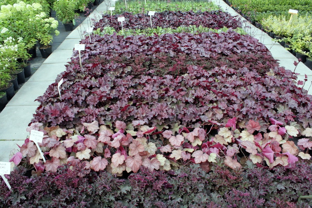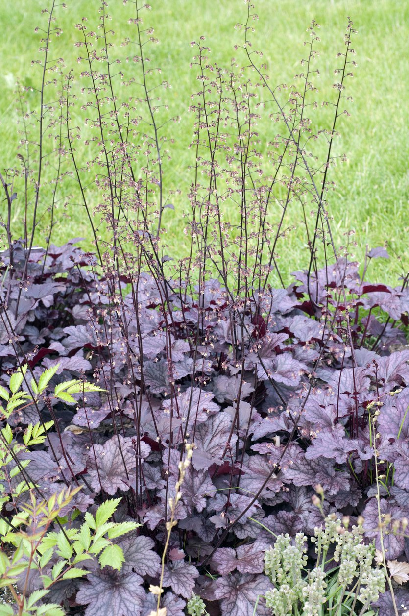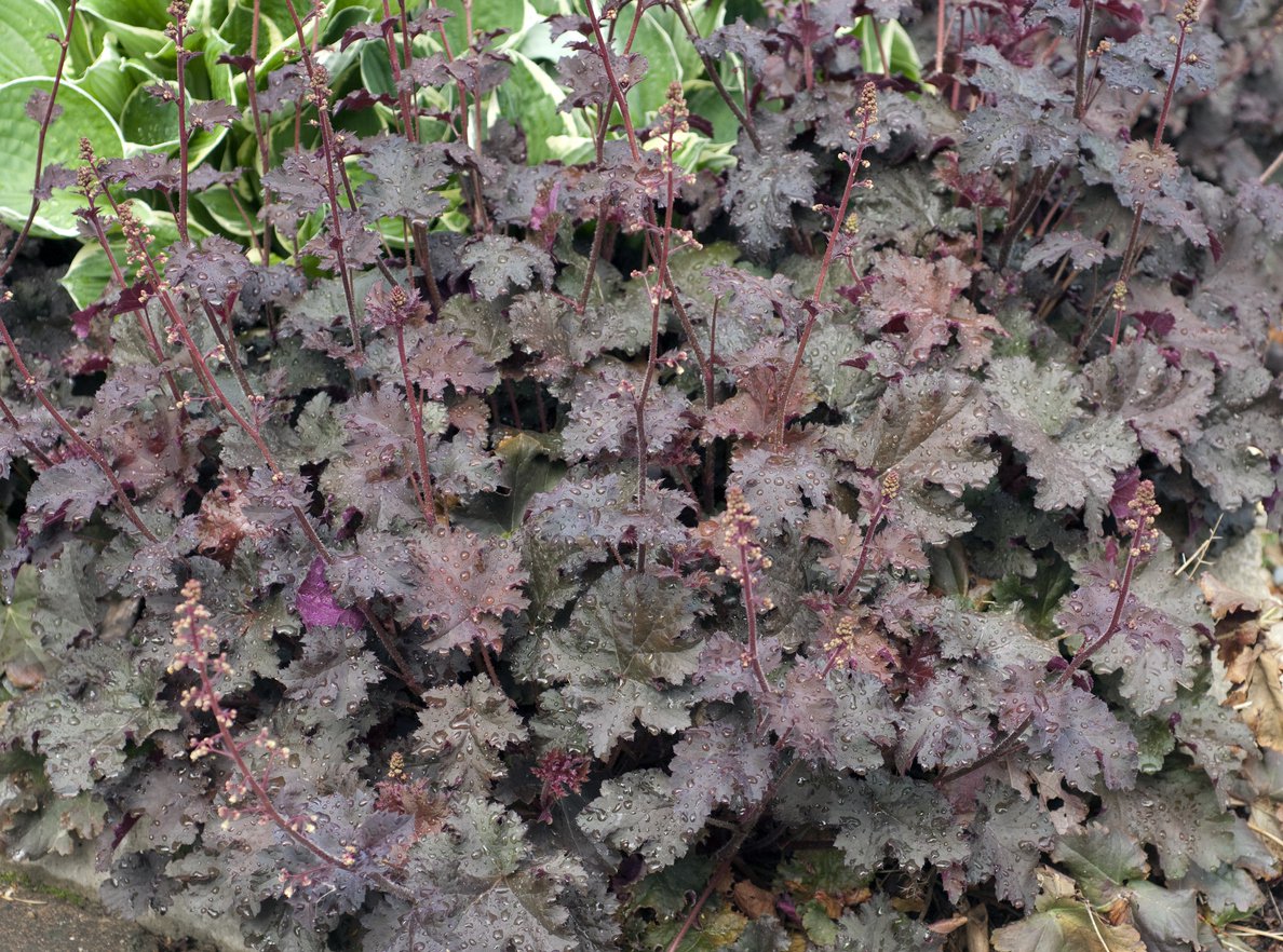 Bylina bujnie rosnąca, tworząca kępy o wysokości 30 cm. Sercowate liście mają 5–7 klap i przypominają w zarysie liście klonu. Są one mocno błyszczące, prawie metaliczne, purpurowo lub wiśniowo-czerwone. Najmłodsze listki są marmurkowate i żyłkowane. W okresie kwitnienia tworzy długie wiechowate kwiatostany kremowych, bardzo drobnych kwiatów. Kwiatuszki mają czerwone pylniki. Roślina w czasie kwitnienia wygląda bardzo subtelne, lekko i zwiewne. Kwitnie w czerwcu i lipcu. Mrozoodporna i łatwa w uprawie, dobrze czuje się na stanowiskach słonecznych i półcienistych. Preferuje gleby żyzne i przepuszczalne. Do stosowania na rabatach, w większych ogrodach skalnych. Nadaje się też do okrywania większych powierzchni.