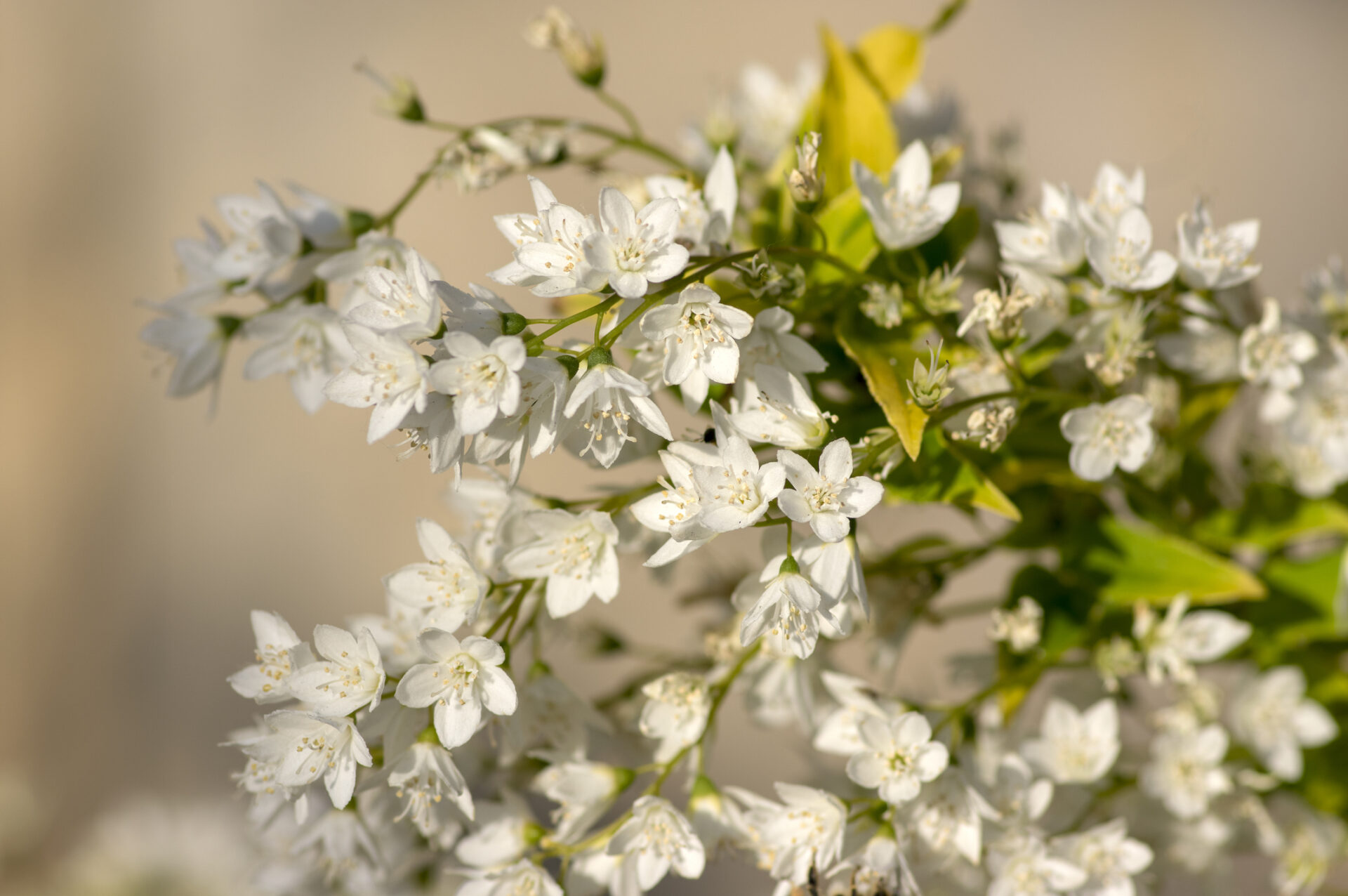 Krzew liściasty dorastający do około 60 cm wysokości. Kwitnie od maja do czerwca, wytwarzając duże kwiaty białe lub delikatnie różowe z pięcioma płatkami i żółtymi pręcikami.